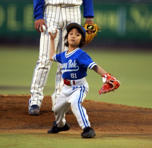 2005년 4월30일 ‘야구신동’ 원태인이 시민구장에서 열린 2005 KBO리그 삼성과 KIA 경기에서 시구하고 있다. 사진 | 삼성 라이온즈 |