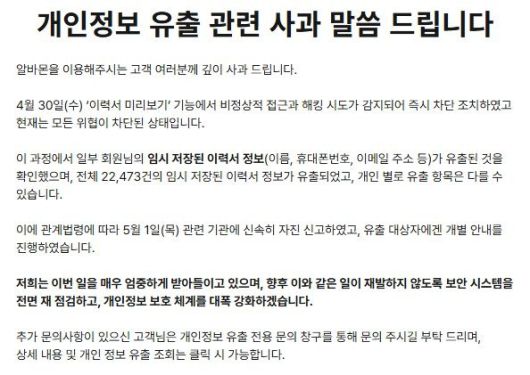 알바몬 측은 "아이디와 비밀번호는 유출되지 않았지만 책임을 깊이 인식하고 있다"며 "보안 시스템을 전면 점검하고 근본적인 개선을 이루는 계기로 삼겠다"고 전했다.