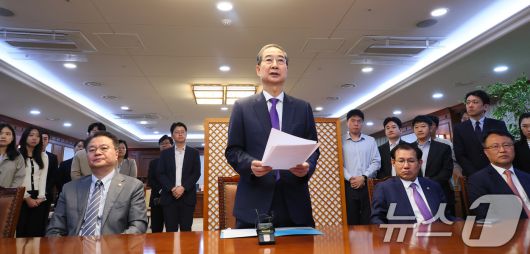 한덕수 대통령 권한대행 국무총리가 1일 오후 서울 종로구 정부서울청사에서 대국민담화를 통해 사퇴를 표명한 뒤 청사 집무실에서 직원들에게 당부의 말을 하고 있다. (총리실 제공, 재판매 및 DB 금지) 2025.5.1/뉴스1 ⓒ News1 임세영 기자 |