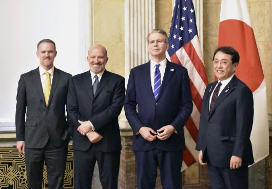 1일(현지시간) 미국 워싱턴DC에서 열린 미국과 일본 간 2차 관세 협상에서 양국 참가자들이 기념 촬영에 응하고 있다. 왼쪽부터 제이미슨 그리어 미국 무역대표부(USTR) 대표, 하워드 러트닉 미국 상무부 장관, 스콧 베선트 미국 재무부 장관, 아카자와 료세이 일본 경제재생상. [연합] |