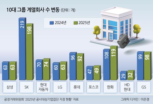 한편 일부 그룹은 사업 재편을 통해 계열사를 줄이며 핵심 사업 경쟁력을 강화하는 추세다. 대표적으로 SK그룹의 경우 지난해에 이어 올해도 고강도의 리밸런싱(재조정)을 지속하고 있다. 기존 사업 중 수익성이 떨어지는 부문은 정리하고, 인공지능(AI) 중심으로 재투자하며 올해 5월 계열회사 수는 198개로 감소했다. 2년 만에 100개대로 줄었으며, 지난해 5월(219개)과 비교하면 21개 감소한 수치다.