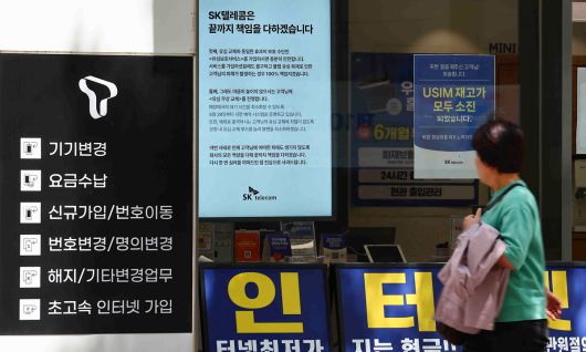 SK텔레콤 고객정보 유출 여파가 계속되는 지난 4월 30일 서울 시내의 SK텔레콤 대리점 앞에 유심(USIM)부족 안내문이 붙어 있다. 뉴시스 |
