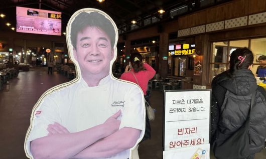 지난 10일 오후 충남 예산상설시장 광장 입구에 세워진 백종원 더본코리아 대표의 사진 입간판 옆으로 방문객들이 들어서고 있다. 송인걸 기자 |