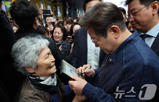 (철원=뉴스1) 이재명 기자 = '골목골목 경청투어 : 접경벨트편'에 나선 이재명 더불어민주당 대통령 후보가 2일 오전 강원 철원군 동송전통시장을 찾아 한 시민의 요청에 서명하고 있다. (공동취재) 2025.5.2/뉴스12expulsion@news1.krCopyright ⓒ 뉴스1. All rights reserved. 무단 전재 및 재배포, AI학습 이용 금지.