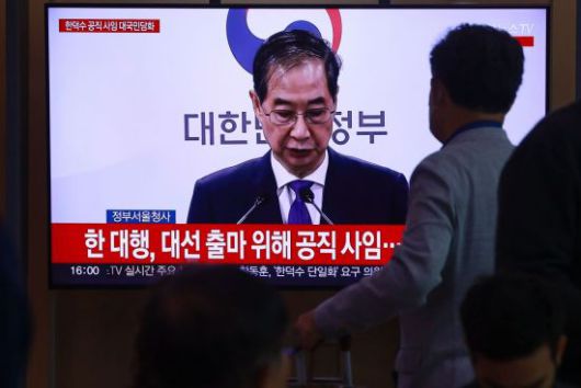 1일 서울역 대합실에서 시민이 한덕수 대통령 권한대행 국무총리의 대국민담화 생중계를 보고 있다. 2025.5.1 연합뉴스 |