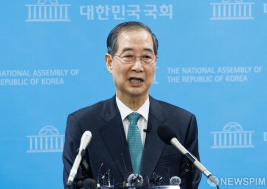 [서울=뉴스핌] 윤창빈 기자 = 한덕수 전 국무총리가 2일 오전 서울 여의도 국회에서 대선 출마 선언을 마치고 취재진의 질문에 답변하고 있다. 2025.05.02 pangbin@newspim.com