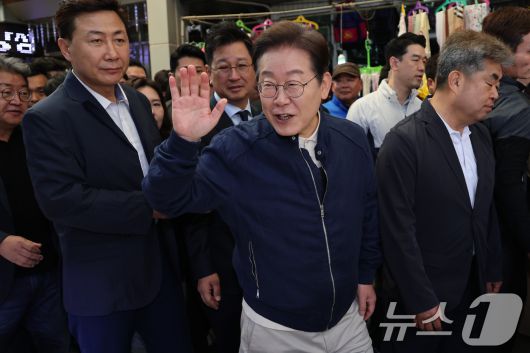 (철원=뉴스1) 이재명 기자 = '골목골목 경청투어 : 접경벨트편'에 나선 이재명 더불어민주당 대통령 후보가 2일 오전 강원 철원군 동송전통시장을 찾아 상인들과 인사를 하고 있다. (공동취재) 2025.5.2/뉴스1