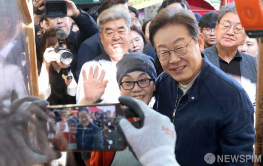 [철원=뉴스핌] 최지환 기자 = 이재명 더불어민주당 대선 후보가 '골목골목 경청투어' 접경지역 방문 이틀째인 2일 오전 강원 철원군 동송전통시장에서 한 가게를 찾아 상인과 기념촬영을 하고 있다. 2025.05.02 choipix16@newspim.com |