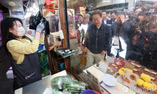 [철원=뉴스핌] 최지환 기자 = 이재명 더불어민주당 대선 후보가 '골목골목 경청투어' 접경지역 방문 이틀째인 2일 오전 강원 철원군 동송전통시장에서 한 가게를 찾아 상인과 대화를 나누고 있다. 2025.05.02 choipix16@newspim.com |