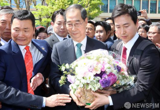 [서울=뉴스핌] 윤창빈 기자 = 한덕수 전 국무총리가 2일 오전 서울 여의도 국회에서 대선 출마 선언을 마치고 나서며 지지자에게 꽃다발을 받고 있다. 2025.05.02 pangbin@newspim.com |