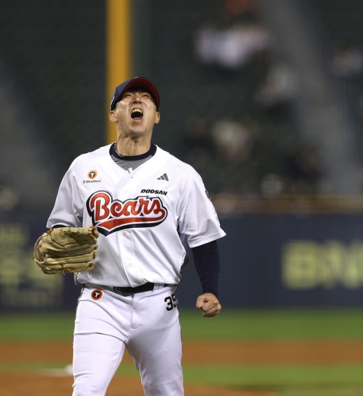 두산 고효준이 1일 잠실구장에서 열린 2025 KBO리그 KT전에서 8회 1사 후 올라와 실점 없이 이닝을 마친 후 포효하고 있다. 사진 | 두산 베어스 |