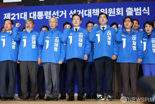 민주당 중앙선거대책위원회는 이날 오전 중앙당사에서 첫 회의를 열었다. 이 자리에 참석한 총괄선대위원장과 공동선대위원장은 "희대의 정치적 판결"이라는 등 비판 입장을 내놨다.