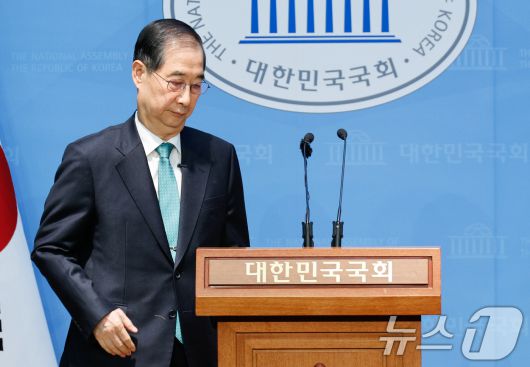 (서울=뉴스1) 안은나 기자 = 한덕수 전 국무총리가 2일 오전 서울 여의도 국회 소통관에서 '국민께 드리는 약속'을 주제로 제21대 대통령 선거 출마를 선언하기 위해 단상에 오르고 있다. 2025.5.2/뉴스1
