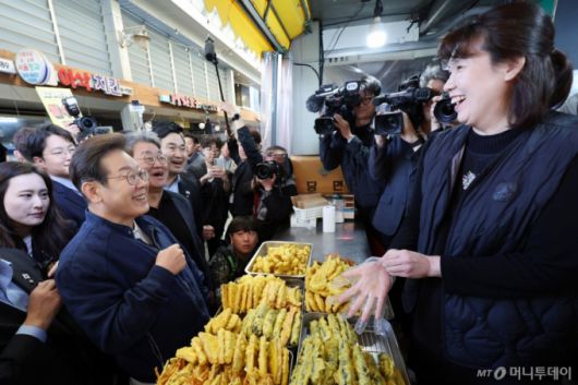 [철원=뉴시스] 조성우 기자 = 민심을 청취하는 '경청 투어'에 나선 이재명 더불어민주당 대선후보가 2일 오전 강원도 철원군 동송전통시장을 찾아 분식점 사장과 대화하고 있다. 2025.05.02. xconfind@newsis.com /사진=조성우 |