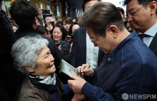 [철원=뉴스핌] 최지환 기자 = 이재명 더불어민주당 대선 후보가 '골목골목 경청투어' 접경지역 방문 이틀째인 2일 오전 강원 철원군 동송전통시장에서 주민에게 사인을 해주고 있다. 2025.05.02 choipix16@newspim.com |