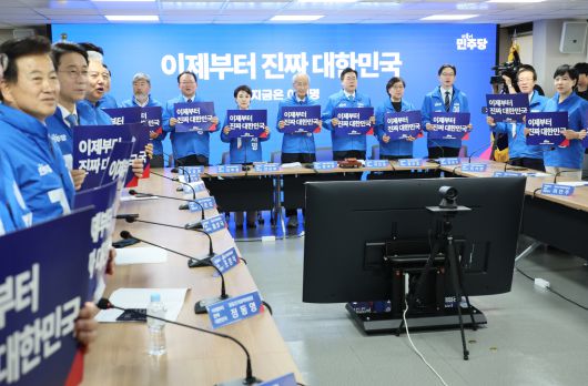 더불어민주당 선대위 인사들이 2일 서울 여의도 중앙당사에서 열린 중앙선거대책위원회의에서 구호를 외치고 있다. 연합뉴스 |