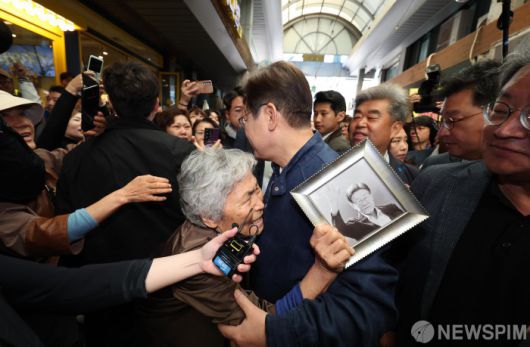 [철원=뉴스핌] 최지환 기자 = 이재명 더불어민주당 대선 후보가 '골목골목 경청투어' 접경지역 방문 이틀째인 2일 오전 강원 철원군 동송전통시장에서 한 주민과 포옹하고 있다. 2025.05.02 choipix16@newspim.com |