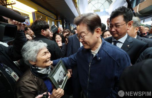[철원=뉴스핌] 최지환 기자 = 이재명 더불어민주당 대선 후보가 '골목골목 경청투어' 접경지역 방문 이틀째인 2일 오전 강원 철원군 동송전통시장에서 주민과 대화를 나누고 있다. 2025.05.02 choipix16@newspim.com |