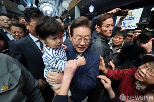 [철원=뉴스핌] 최지환 기자 = 이재명 더불어민주당 대선 후보가 '골목골목 경청투어' 접경지역 방문 이틀째인 2일 오전 강원 철원군 동송전통시장에서 한 아이를 안아주고 있다. 2025.05.02 choipix16@newspim.com |