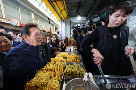 분식점 상인과 대화하는 이재명 후보