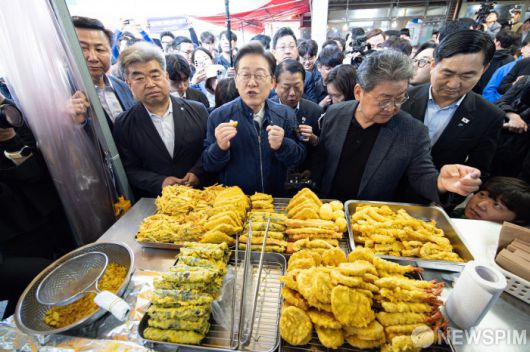 [철원=뉴스핌] 최지환 기자 = 이재명 더불어민주당 대선 후보가 '골목골목 경청투어' 접경지역 방문 이틀째인 2일 오전 강원 철원군 동송전통시장에서 분식점을 방문해 튀김을 먹고 있다. 2025.05.02 choipix16@newspim.com