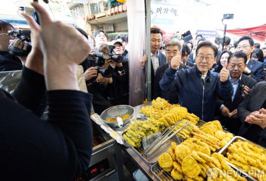 [철원=뉴스핌] 최지환 기자 = 이재명 더불어민주당 대선 후보가 '골목골목 경청투어' 접경지역 방문 이틀째인 2일 오전 강원 철원군 동송전통시장에서 분식점 상인과 인사를 하고 있다. 2025.05.02 choipix16@newspim.com |