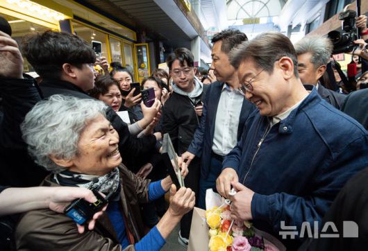 [철원=뉴시스] 조성우 기자 = 민심을 청취하는 '경청 투어'에 나선 이재명 더불어민주당 대선후보가 2일 오전 강원도 철원군 동송전통시장을 찾아 한 시민과 대화하고 있다. (공동취재) 2025.05.02. photo@newsis.com |