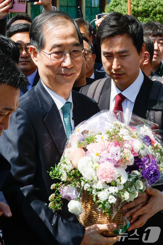 (서울=뉴스1) 안은나 기자 = 한덕수 전 국무총리가 2일 오전 서울 여의도 국회 소통관에서 '국민께 드리는 약속'을 주제로 제21대 대통령 선거 출마를 선언한 뒤 지지자로부터 받은 꽃바구니를 들고 있다. 2025.5.2/뉴스1coinlocker@news1.krCopyright ⓒ 뉴스1. All rights reserved. 무단 전재 및 재배포, AI학습 이용 금지.
