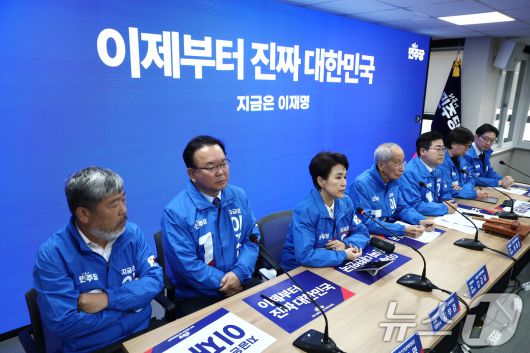 (서울=뉴스1) 김민지 기자 = 강금실 더불어민주당 총괄선거대책위원장(왼쪽 세번째)이 2일 오전 서울 여의도 중앙당사에서 열린 중앙선거대책위원회의에서 발언하고 있다. 2025.5.2/뉴스1kimkim@news1.krCopyright ⓒ 뉴스1. All rights reserved. 무단 전재 및 재배포, AI학습 이용 금지.