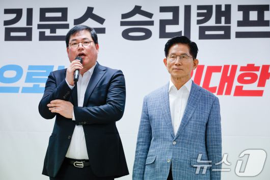 (서울=뉴스1) 안은나 기자 = 유동규 전 성남도시개발공사 본부장이 2일 서울 여의도 김문수 국민의힘 대선 경선 후보 캠프를 찾아 지지 선언하고 있다. 2025.5.2/뉴스1coinlocker@news1.krCopyright ⓒ 뉴스1. All rights reserved. 무단 전재 및 재배포, AI학습 이용 금지.