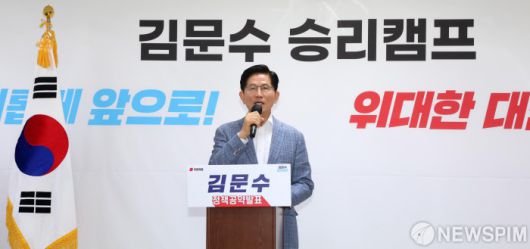 [서울=뉴스핌] 윤창빈 기자 = 김문수 국민의힘 대선 경선 후보가 2일 오전 서울 여의도 선거사무소에서 열린 청년 정책 전달식에서 인사말을 하고 있다. 2025.05.02 pangbin@newspim.com