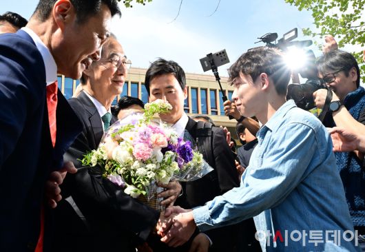아시아투데이 이병화 기자 = 한덕수 전 국무총리가 2일국회 소통관에서 '국민께 드리는 약속'을 주제로 제21대 대통령 선거 출마를 선언한 뒤 지지자로부터 꽃바구니를 받고 있다. ⓒ "젊은 파워, 모바일 넘버원 아시아투데이"