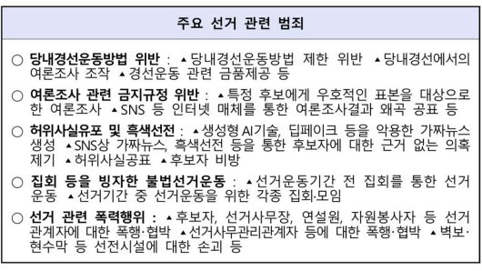 특히 당내 경선 운동 방법 위반, 여론조사 관련 금지 규정 위반, 소셜미디어(SNS) 등을 이용한 허위 사실 공표, 집회 등을 빙자한 불법 선거 운동, 선거폭력 등 발생 가능성이 높은 선거 범죄에 수사 역량을 집중하고 금품 수수, 공무원·단체의 선거 개입 등에도 엄중히 대처할 방침입니다.