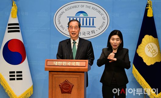 아시아투데이 이병화 기자 = 한덕수 전 국무총리가 2일 국회 소통관에서 '국민께 드리는 약속'을 주제로 제21대 대통령 선거 출마를 선언하고 있다.