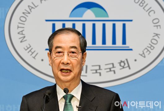 아시아투데이 이병화 기자 = 한덕수 전 국무총리가 2일 국회 소통관에서 '국민께 드리는 약속'을 주제로 제21대 대통령 선거 출마를 선언하고 있다.