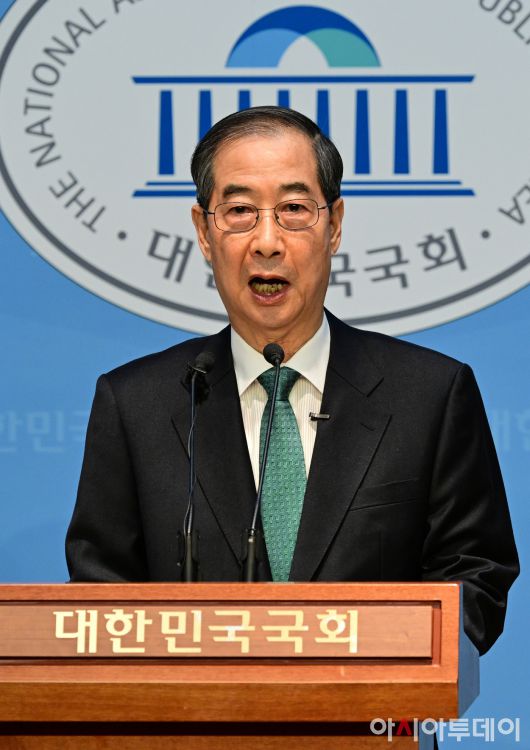 아시아투데이 이병화 기자 = 한덕수 전 국무총리가 2일 국회 소통관에서 '국민께 드리는 약속'을 주제로 제21대 대통령 선거 출마를 선언하고 있다.