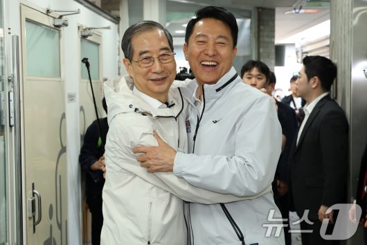 (서울=뉴스1) 김명섭 기자 = 제21대 대통령 선거에 출마한 한덕수 전 총리가 2일 서울 종로구 주민공동시설 '새뜰집'에서 오세훈 서울시장과 포옹하고 있다. 2025.5.2/뉴스1msiron@news1.krCopyright ⓒ 뉴스1. All rights reserved. 무단 전재 및 재배포, AI학습 이용 금지.