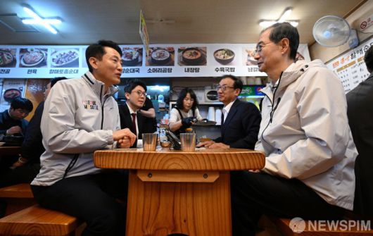 [서울=뉴스핌] 양윤모 기자 = 제21대 대선 출마를 선언한 한덕수 전 국무총리가 2일 오후 오세훈 서울시장과 함께 서울 종로구의 식당에서 오찬 회동을 갖고 대선 행보를 시작했다. [공동취재] 2025.05.02 yym58@newspim.com