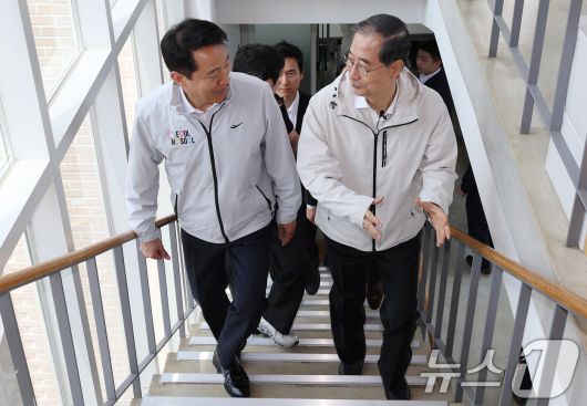 (서울=뉴스1) 김명섭 기자 = 제21대 대통령 선거에 출마한 한덕수 전 총리가 2일 서울 종로구 주민공동시설 '새뜰집' 에서 오세훈 서울시장과 대화를 하고 있다. (공동취재) 2025.5.2/뉴스1msiron@news1.krCopyright ⓒ 뉴스1. All rights reserved. 무단 전재 및 재배포, AI학습 이용 금지.