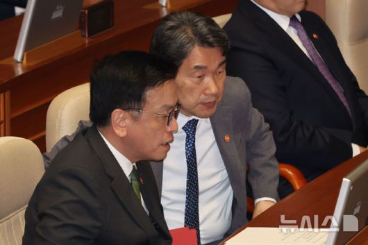 [서울=뉴시스] 권창회 기자 = 1일 서울 여의도 국회에서 열린 제424회 국회(임시회) 제7차 본회의에서 최상목 경제부총리 겸 기획재정부 장관과 이주호 사회부총리 겸 교육부 장관이 대화하고 있다. 2025.05.01. kch0523@newsis.com |