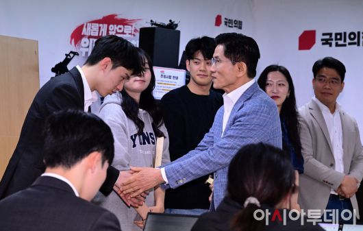 아시아투데이 이병화 기자 = 김문수 국민의힘 대선 경선 후보가 2일 서울 여의도 캠프에서 열린 청년정책 제안서 전달식에서 참석자들과 악수하고 있다. ⓒ "젊은 파워, 모바일 넘버원 아시아투데이"