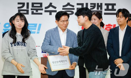 (서울=뉴스1) 안은나 기자 = 김문수 국민의힘 대선 경선 후보가 2일 서울 여의도 캠프에서 청년정책 제안서를 전달받은 뒤 참석자와 악수하고 있다. 2025.5.2/뉴스1coinlocker@news1.krCopyright ⓒ 뉴스1. All rights reserved. 무단 전재 및 재배포, AI학습 이용 금지.