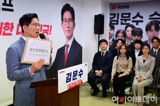 아시아투데이 이병화 기자 = 김문수 국민의힘 대선 경선 후보가 2일 서울 여의도 캠프에서 청년들로부터 ‘결혼·출산·육아’, ‘일자리와 경제’ 등 16개 청년정책 제안서를 전달받은 뒤 발언을 하고 있다.