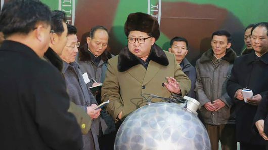 ▲ 2016년 3월 김정은 북한 노동당위원장이 핵탄두 기폭장치 추정 물체 앞에서 핵무기 연구 부문 과학자, 기술자들을 만나 지도하는 모습
