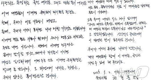 한동훈 국민의힘 대선경선 후보가 2일 아침, 이재명 민주당 후보를 막을 사람은 자신 뿐이라며 지지를 호소하는 손편지를 보냈다. (SNS 갈무리) ⓒ 뉴스1 |