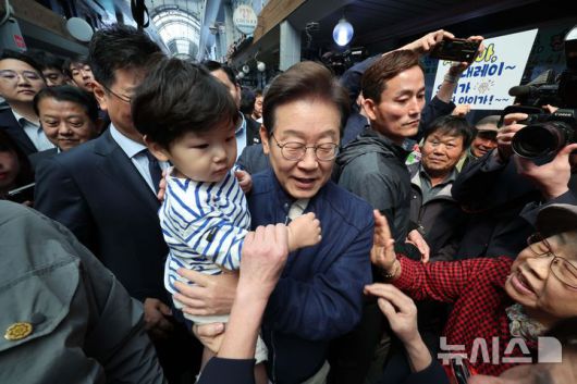 [철원=뉴시스] 조성우 기자 = 민심을 청취하는 '경청 투어'에 나선 이재명 더불어민주당 대선후보가 2일 오전 강원도 철원군 동송시외버스공용터미널 인근에서 어린이를 안아주고 있다. 2025.05.02. xconfind@newsis.com |
