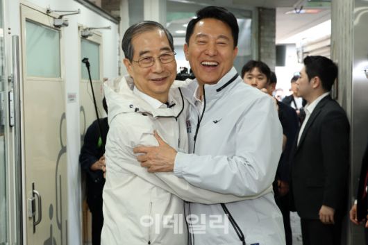 [이데일리 김태형 기자] 제21대 대통령 선거에 출마한 한덕수 전 총리가 2일 서울 종로구 주민공동시설 '새뜰집'을 방문해 오세훈 서울시장과 포옹하고 있다.
