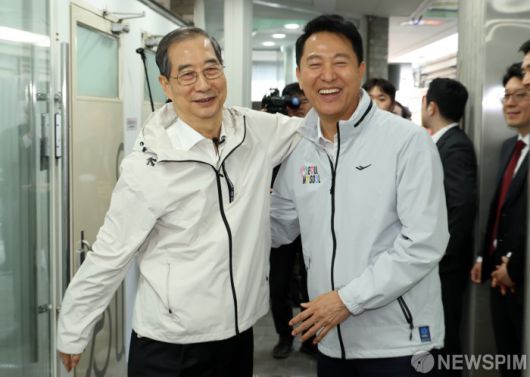 [서울=뉴스핌] 양윤모 기자 = 제21대 대선 출마를 선언한 한덕수 전 국무총리가 2일 오후 오세훈 서울시장과 함께 서울 종로구의 주민공동시설 '새뜰집'에서 어깨동무를 하며 대선 행보를 시작했다. [공동취재] 2025.05.02 yym58@newspim.com
