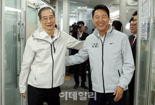 [이데일리 김태형 기자] 제21대 대통령 선거에 출마한 한덕수 전 총리가 2일 서울 종로구 주민공동시설 '새뜰집'을 방문해 오세훈 서울시장과 인사하고 있다.