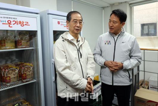 [이데일리 김태형 기자] 제21대 대통령 선거에 출마한 한덕수 전 총리가 2일 서울 종로구 주민공동시설 '새뜰집'을 방문해 온기창고에서 오세훈 서울시장과 대화하고 있다.